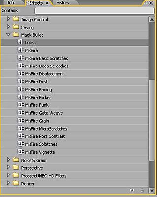 The Magic Bullet Looks filter that is in there with the Misfire stuffs is all that controls the whole gizmo! The rest are presaved custom presets that are in a folder in effects somewheres :) Carl