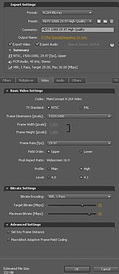 Although directed at Graham, allow me to give you my results, exporting to H.264-BR VBR-1 pass, target 25 and max 30, 1920 x 1080 25i with AC3 5.1 448 Kb sound, results in these rates:
