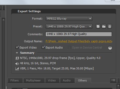 What I am referring to, of course, is outputting a Blu-Ray project which was shot on HDV using the same codec as the source material to avoid transcoding long sequences where there are no transitions or effects. The majority of my work is basic cuts on long sequences of musical performances. I mistakenly made a reference to exporting in H.264. It is, of course, the MPEG-2 setting which is correct to match material shot in HDV. What I found was that the default settings for Blu-Ray MPEG-2 medium quality in the export menu of Premier created files which appear not to have been transcoded. I tested these for their similarity to the project codec simply by reimporting them and placing them on the timeline. They did not trigger a red "render indeed" bar above them indicating that they were the same codec as their project resolution. Therefore I believe they match. The HDV codec from from my Canon XHA1 is 1440 x 1080i 25mps 29.97 fps Constant Bit Rate-the number of pictures in a group equals 12, P-frames occur every three frames Premieres default settings above are slightly different although the decoder apparently decides not to re-encode. The difference is that those settings call for a variable bit rate one pass process. The average data rate is the same however at 25 MB per second. My conclusion is that the Blu-Ray medium quality default MPEG-2 settings will export HDV material without transcoding. Any thoughts or comments appreciated Kevin |