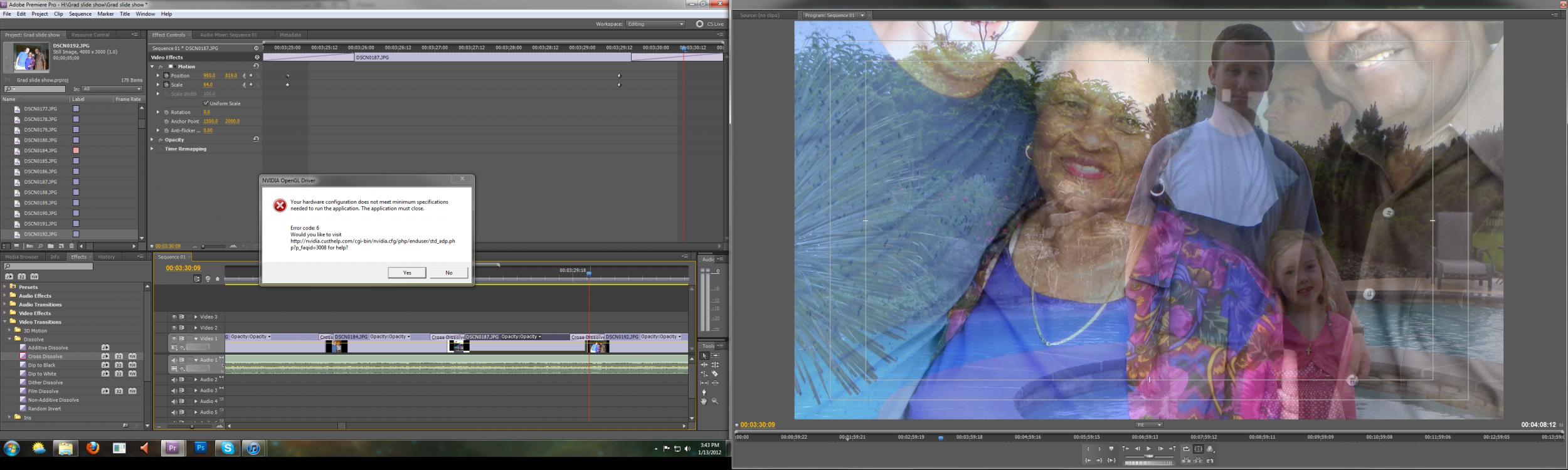 Ok im scratching my head. I keep getting the error code 6. On this particular project all it is a photo montage with basic fades and pans nothing to fancy now that the projects up over 3 minutes the crashing has become more frequent the only way to get cs5 open again is to restart the computer. This doesn't happen often when i do HD video im talking mulit cam multi audio track and its fine. The only thing i have changed recently is i upgraded to a bigger preview monitor