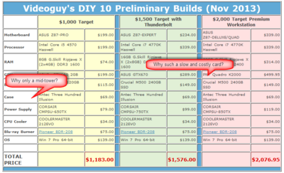 I contacted Gary about this list and his only consideration in putting it together like this is a $ 2000 price for Avid users. Otherwise he would have been off much cheaper and with better performance by choosing a GTX 660 Ti instead of a super slow K2000. He could have used that to get a big tower instead of a mid tower. But Videoguys are steering their clients to more expensive external storage (I assume they have better margins on those), rather than internal storage.