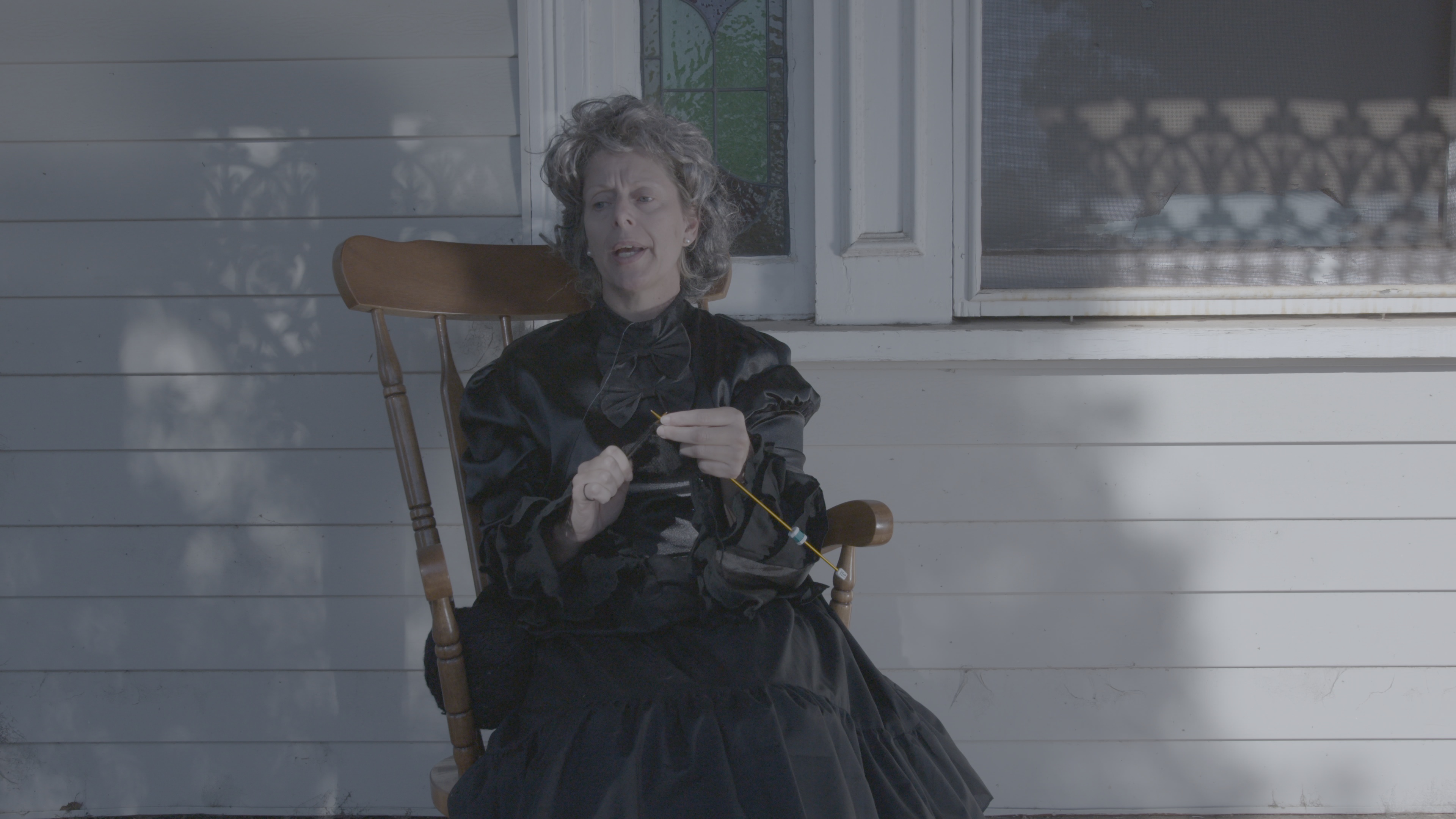 The dress suggest 19th century: They did not have plastic knitting needles with numbers back then.