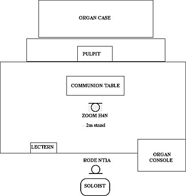 I've been asked to work on a project to record a number of solos songs performed with organ accompaniment in my church. I've had a couple of short rehearsals/test recordings and have developed the setup a little after listening to the tests.