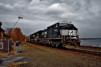 My distance from the track varies dependent on the location and available shooting space. The shot showing the equipment was in Duncannon, Pa. on the NS Pittsburgh Line along the Susquehanna River. I try to get 25 feet but some locations are tighter. 15 feet overall, is the closest I ever get to the side of the tracks. In my comment, the 15 foot number is about how high the mic ends up above me. as you can see in the picture, it's slightly closer to the action then me. When this close I have to be watching the levels on the 302 right as the engines arrive. But when set correctly the first time, every train thereafter is usually fine. As long as I'm lighting the led's near the top threshold on the 302, and not hitting the limiters I'm fine. The entire audio package is always kept right next to me. I use 25 foot cables, and have longer, but I've never gotten in a situation where I needed them. On the shot with the OCS train, the cam, mic, and audio equipment were set up at about 150-175 feet from the train. The only thing I did was keep the height of the mic lower and sloped out in front of me about 5-7 feet but high enough as to not be in my shot. Longswamp Twsp, Pa. is on the Berks & Lehigh County line. not far from Kutztown, Pa. Steve |