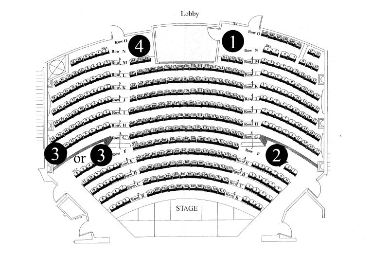 Greg, we usually have two cams behind the back row, about 50 feet from the stage, on either side of the booth, which is centered behind the back row. We also have two cams on the sides, on a platform behind the fifth row on the side seating areas. There's a small half wall behind each platform which hides our cams pretty well. The theatre was designed by some big-shot acoustical designer who I think did the main Symphony Concert Hall here in Seattle. The walls are covered with all these pyramid-shaped acoustic reflecting panels and it sounds great live. It's just when we try to make the sound stick to the videotape that we have issues. Here's the floorplan. The proscenium itself is actually the very bottom of the picture with the main part of the stage not shown.