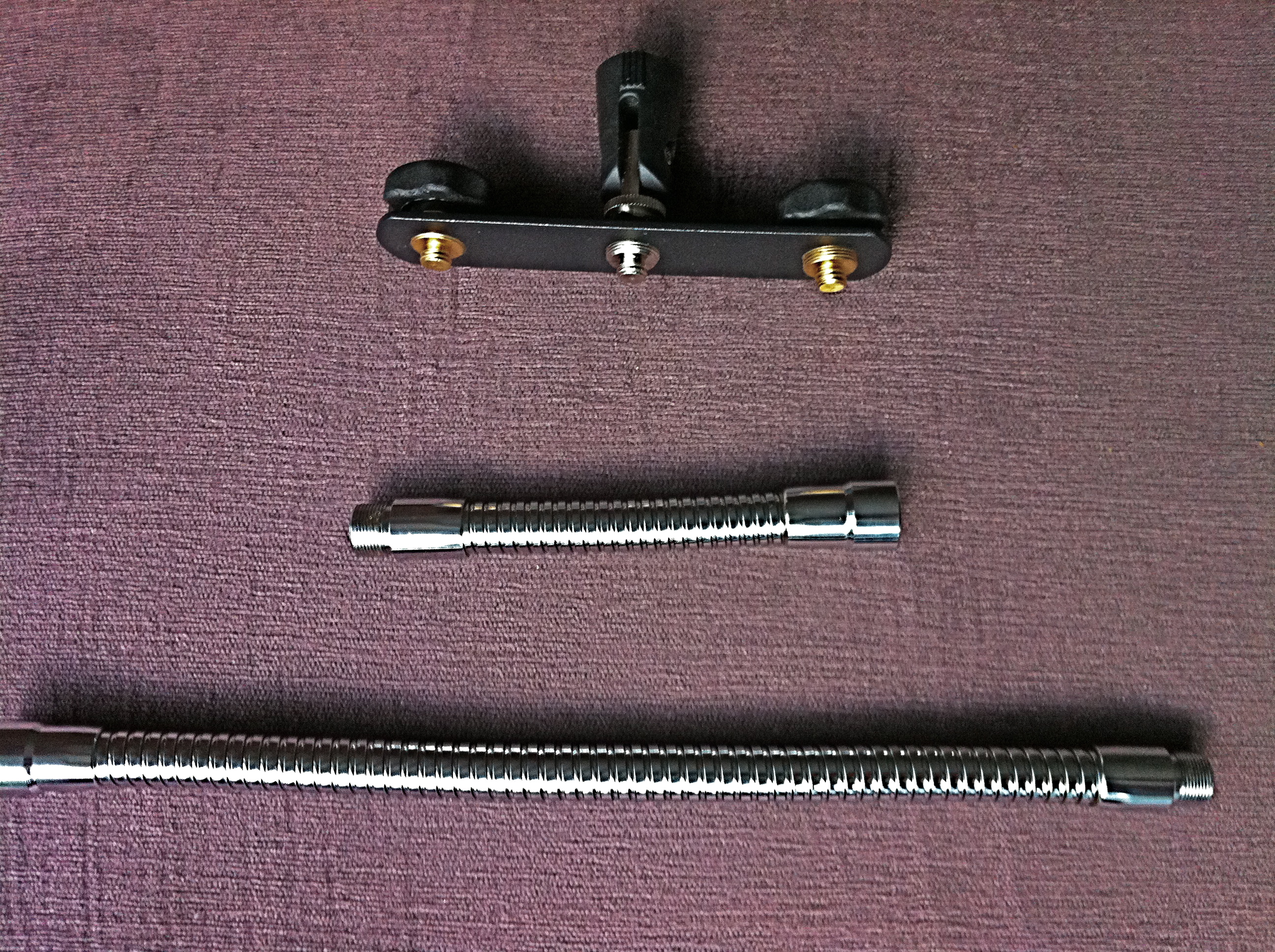Spacebar Stereo Microphone Positioners Stereo Bar Assembly » Rycote but instead I spent about £15 at Maplin for a basic stereo bar and two goosenecks. With these I can do a pretty quick ORTF setup using a card template and a slightly less quick X-Y rig. A bit fiddly, but certainly more affordable if like me you only record a few orchestras, choirs or ensembles every year. I have to say the SM6 shockmount that comes with the Rode NT2A studio pack has a great unadvertised feature - the pop shield mounting has a standard 5/8" male thread on it so you can easily suspend another mic over it with a suitable spacer or gooseneck. It only takes a me couple of minutes now to set up for M-S. I have found this thread very interesting - thanks for starting it James! Pics of ORTF (top row) and X-Y rigs (middle left) using a pair of Rode NT1As and M-S rig (middle right and bottom row) using a Rode NT2A for the side mic. The Maplin stereo bar and goosenecks are also shown. |