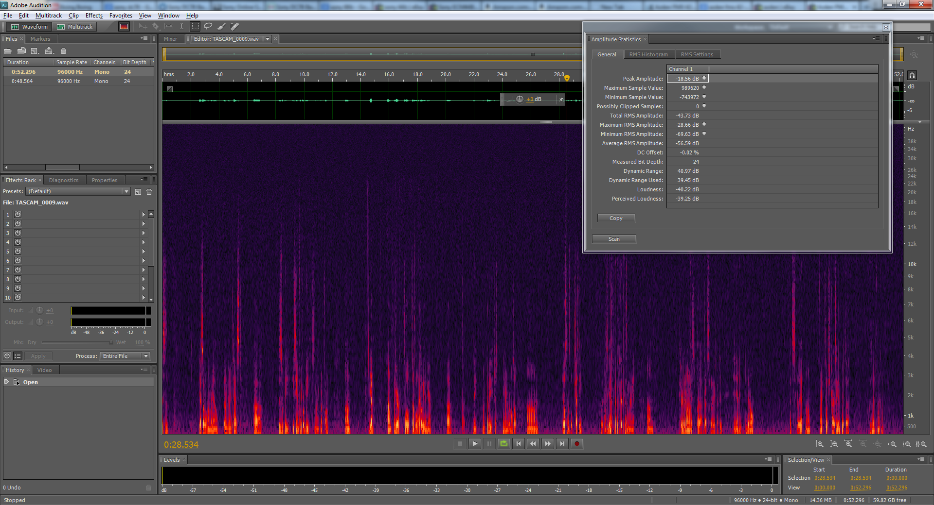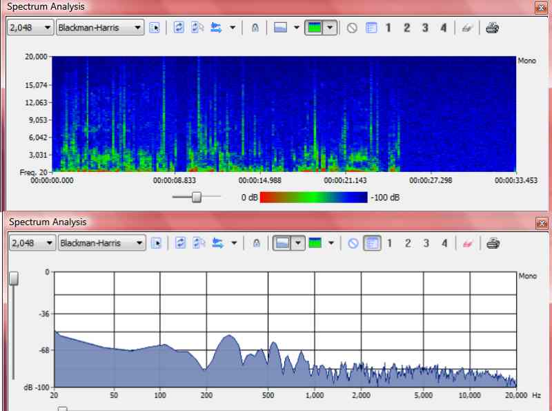 I would say for the most part, they performed about the same, the 88B had a bit more dynamic range. Both had low output signal, and the same noise level. So it seems clear the issue is with the Tascam DR-40's preamps (I also tested it with a cheap-o hand held dynamic mic, mostly the same deal.) The input level on the DR-40 was at 68 percent. I have attached a sample of the audio of the 44B, which peaked at -18.5 dB. I then normalized this to -2 dB in Adobe Audition, so you could hear the noise level at a practical amplitude. Also, I'm attaching a screen shot of the spectral graph and amplitude statistics from Audition prior to normalization. |