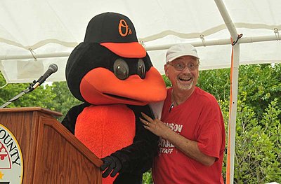 Always good to see you out here. :) I did notice an on-camera mic on a Baltimore TV station news camera on the 4th of July. He came to record sections of the Towson, MD July 4th Parade. He has strapped a mic onto the camera handle and it looked like it had been there a while (as in years). This is called gathering b-roll with sound. The audio is secondary (or tertiary) and will probably not be used at all. The camera was on sticks and the sound field was so loud when the bands came by that I'm pretty sure you couldn't hear and lens motors. He did go hand-held at least once, and threaded through the ranks of one of the bands, but again, usable audio was not the task. Regards, Ty Ford PS: I was the MC of the parade. Here I am conversing with the Baltimore Orioles Bird Mascot (who never speaks!) And that's an SM58 on the stand. |