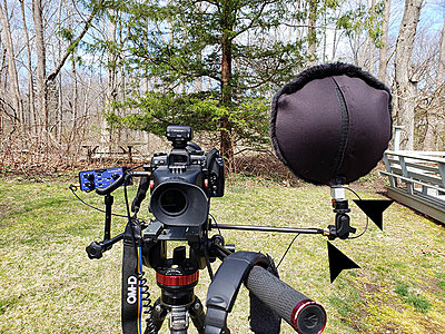 I've tried the kind of rig Chris suggests. It pick up more camera noise and obstructs my own vision. (I'm working with a 500 mm lens, and often, a 1.4 teleconverter.) I need to be able to sight along the lens to find things like birds. I recognize the long arm is a problem, and experimented with marginally shorter arms but the arm I'm using seems the least noisy. I'm surprised that no one else seems to have experience with a parabolic mic. The sound field is much deeper than with shotgun. Here's a recent sample, shot from about 80 yards away. |