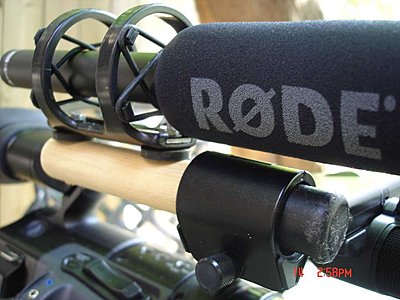If you look a few threads below at "Mounting Rode NT2 to an XL2?", you'll see a couple of suggestions that might help. I've also seen a product called a JRod that is supposed to help with that exact problem. You can do a search for that. For my Z1, I took apart the shock mount that came with my Rode, screwed it to a bit of broom stick handle that fit exactly in my mic holder, and mounted the shock mount to that. Works like a charm. I painted it blue after I took these pictures The left over shoe attachment came in handy for my wireless transmitter, too, so it all worked out. I'm guess what I'm trying to say is, don't be afraid to mess around and build something if you can't find a product that will do what you want... |