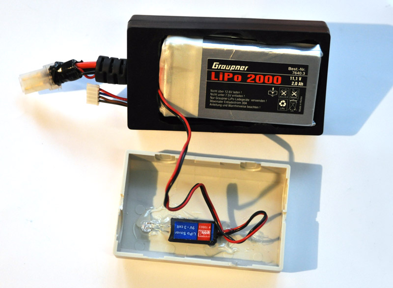 Battery update: I've soldered a 'LiPo saver' on the battery wires and put everything in an improvised enclosure with rod support mount. The 'LiPo saver' is a LED light that lights up when the battery reaches 9v (3v per cell). This is because a LiPo battery must not be discharged under 2.5v per cell. Maybe it would be possible to make a relay in stead of the LED and actually shut down the battery (or maybe it already exists) |
