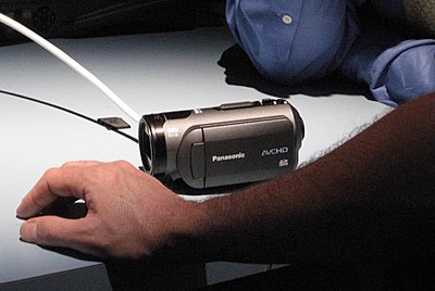 This tiny camera was attracting a lot of attention at the NAB Panasonic booth. Very sexy looking, all black finish, HDMI output. I hadn't heard of this model before, but admit I haven't been following these small AVCHD cameras. It's a bit smaller than the Canon HV20