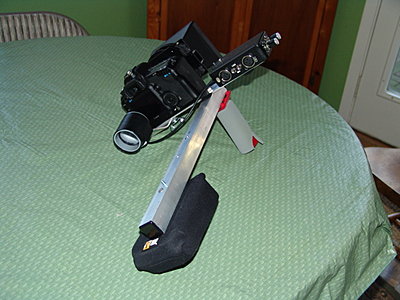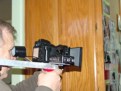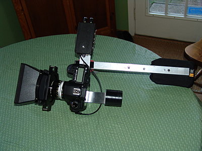 The design ended up the way it did because I want camera ofset so an eyepiece could be used to view the LCD. I originally used a 2 pound weight to balance camera on others side of side, and had the XLR adapter mounted on the spine instead, but it got a bit heavy that way. Using the XLR adapter does help balance it pretty well. I don't even know what brand the filter/shade is, it came in a box full of shades and bellows from fellow member Chris Swanberg who has collected them over the years. The eyepiece in this mockup is 1 1/4 or 1/2 plastic conduit union into which tape fitted an achromat I had gotten from the Surplus Shed last year when I was trying to make my own 35mm adapter. (This project is a much better use, frankly !! :>)) Attached are pictures of this unusual configuration.