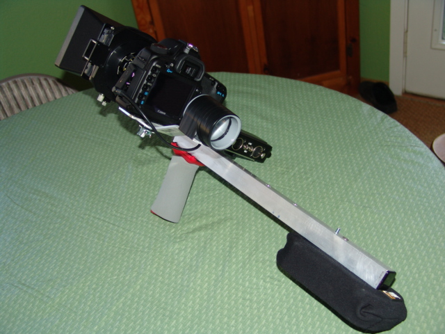I set out to mockup a working shoulder rest shooting rig for the Canon 5D Mark II, and came up with what I call the "Cross Bow", because it looksl like the cross bows launders.