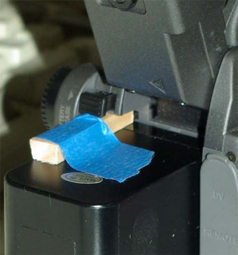 Abit if masking tape (or tape and color of your choosing). (Might even be able to do it with bits of velcro.) A piece of wood about 1/4" thick and wide (measure to fit). Be sure the viewfinder can pivot fully. It will prevent the battery form sliding up and off the camcorder.