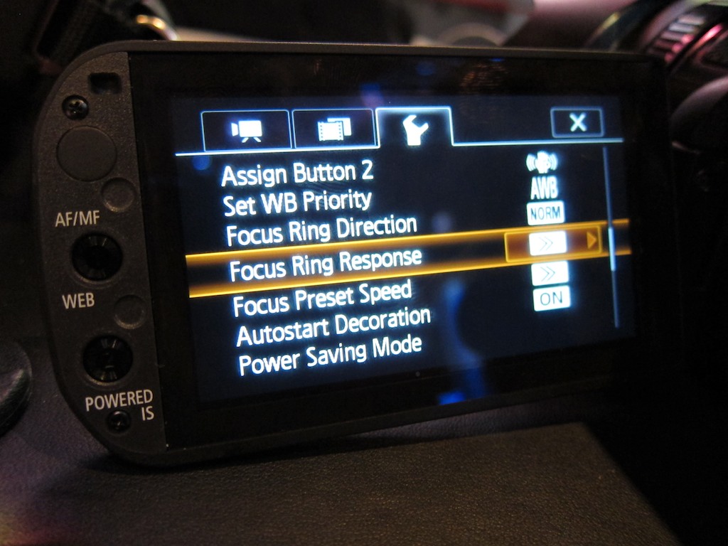 The camera has a full manual mode... a first for any VIXIA! Other things I noticed: ND filter can be turned on/off. There is an image orientation option where you can flip it for 35mm adapters. White balance Kelvin adjustment the same as XL/XH/XF cams (just done in touch screen menu though). You can change the direction of the control ring. And there are 2 assignable buttons. I gotta go into the show now... last day! Need to shoot this NBC video now so dunno if I can go back and look at the camera further, but I'll try. |