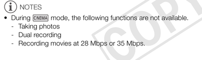 If you select 59.94p (35Mbps) in mp4 format in Standard (Normal) mode and switch to Cinema Mode it changes to 29.97p. If you select 59.94p (28Mbps) in AVCHD format in Standard (Normal) mode and switch to Cinema Mode it changes to 59.94i. So no 59.94p in Cinema Mode but you do at least have the options of 23.98p and 29.97p in mp4 format and 23.98p, 29.97PF, 59.94i in AVCHD format. Shows how much I use Cinema Mode. |