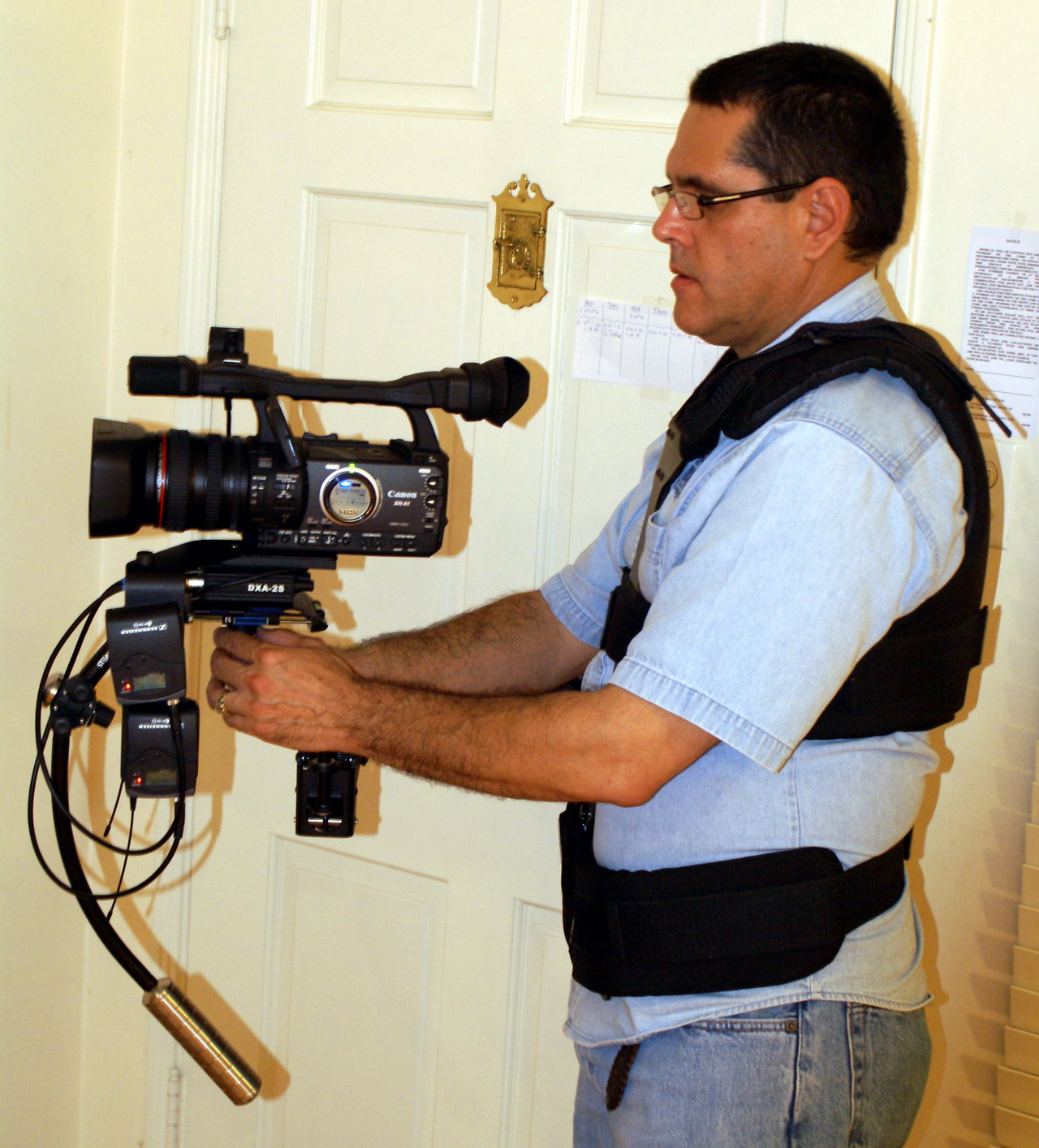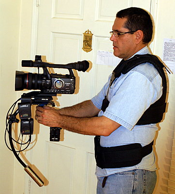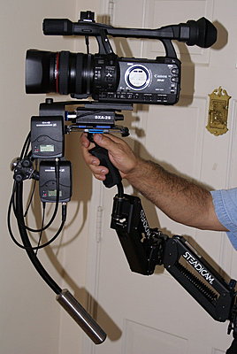I'll start by showing in these 3 photos what I explored with so far. Included hardware: Canon XH A1 HD Video Camera Canon Extended Battery Pack (fills entire battery cavity) Sony Rubber Eye Cup (p/n 217941401 or 2-179-414-01) $38.40 BeachTek DXA-2S Dual XLR Adapter 2 Sennheiser Wireless Mics. 1 Bracket1* www.Bracket1.com *A new Bracket 1 HD is now available http://www.bracket1.com/brackets.php and may be a better choice than what I had... MERLIN SET-UP: Dove Plate @ Position H Collar Fully Inserted Spar Fully Extended 2 Finish Weights 8 Middle Weights Also... I just ordered a 'J-Rod' with a 3-Shoe setup from Jeff which I'll have on Wednesday to also test with a RODE NTG-2 shotgun mic, one Zenn Wireless Mic and the much heavier Canon Wide-Angle glass. We'll see... Surprisingly to me, the Steadicam was more stable overall and more forgiving staying in the horizontal plane longer even when exposing it to sudden movements. The system achieved even smoother footage with the added extra weight. BTW, I calculated the total system at 11 lbs. and that's approx. 3.5 lbs. more than then maximum Merlin/Arm/Vest recommended payload. Incidentally, the reason why I'm using two wireless mics, I will be following two commentators at a Porsche vintage racing event, also conducting interviews, describing some of the fantastic historical machinery, etc. Should be lots of fun! http://www.rennsport2007.com/index.htm Again, I'm very interested to see photos, details, setup specs. of what others are doing when hanging accessories to their vest/arm equipped Steadicam Merlins. Incidentally, I'm NOT recommending anyone to exceed the manufacturer’s specs. but if it works, that's OK by me. For now, check this out... Last edited by Armando Serrano; October 27th, 2007 at 12:56 PM. |
