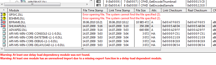 Warning: At least one delay-load dependency module was not found. Warning: At least one module has an unresolved import due to a missing export function in a delay-load dependent module. GPSVC.DLL: Error Opening file. The system cannot find the file specified (2) IESHIMS.DLL: Error Opening file. The system cannot find the file specified (2) There are also couple of DLLs highlighted (see attachment) with no error message next to them. Could this be the reason of my troubles? Thanks, -Ivan |