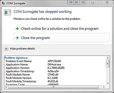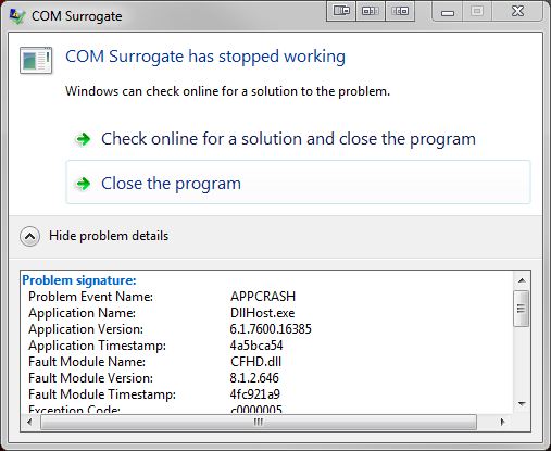 In simple terms, Windows Explorer, when faced with thumbnails/video/audio that it doesn't trust, opens a dummy process (a surrogate) so that the files can run in it. So if the codec is at fault, when the process crashes, the surrogate crashes - and not Explorer. If Explorer didn't have this function, it would crash instead - and that's a whole lot messier. Uninstall cineform, clean the registry and re-install. If you're still having issues, you'll have to get cineform's tech support - maybe there's a patch.