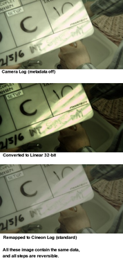 Sergio, Somehow this seems more complex than is actually is. If in doubt use 32-bit linear and export to TIFF 16-bit per channel, that will represerve all you tonal range if you have the metadata switch off. In your DI suite, white-balance the clip(s), then reapply the look. You can do the same with Cineon you just need to be careful with the controls -- never encode linear as linear in a 10-bit Cineon file as there is not enough precision. With AE in 32-bit mode (photometerically linear), export to Cineon with "standard" and logarithm mapping, this will reserve the dynamic range and easily handle by any DI system. This is very like working with Viper Filmstream data. Jason -- Can you use the in-built speed grade to remap the look to linear? Current look file are typically SI-Log mapping 2.2 display gamma. It would be nice to remap the same look to linear to linear and linear to display gamma. For this would be no issue for SpeedGrade DI. What we need a simple LUT remapper for DI suite that use linear or cineon curves, etc.