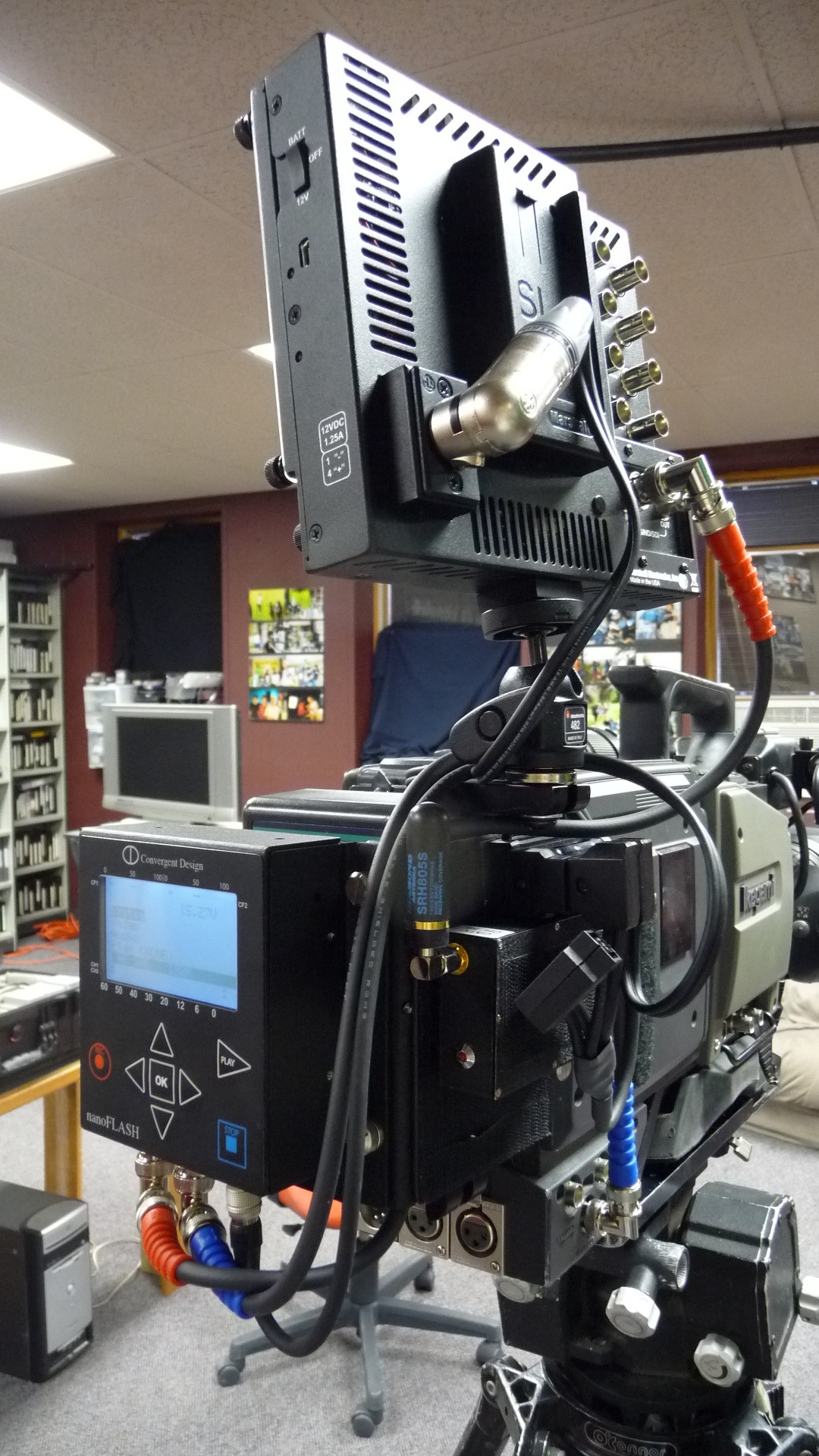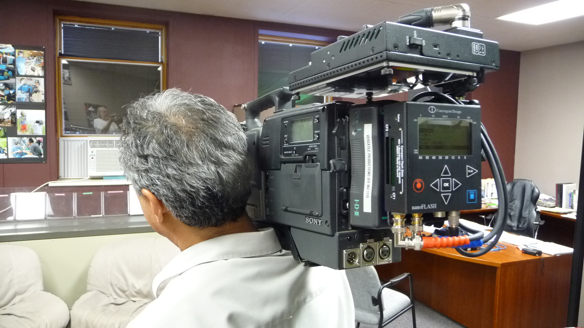 I promised some pix of this rig mounted on an HDX-900. Here's a couple of quick snaps. The camera operator's comment about the added shoulder weight was "I wouldn't want to do it all day but it isn't too bad." From this guy, that's a rave. ;-) We shot all but a few shots on sticks.