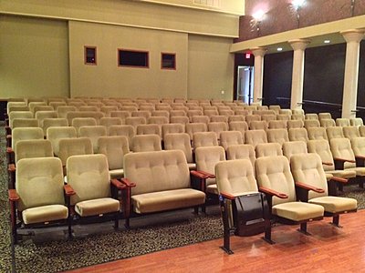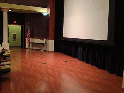 John - I don't have the opportunity to do the interviews at their homes, unfortunately. I am shooting at a movie theater in a retirement community. I was planning on setting up the camera and backdrop on the main floor in front of the screen. I could also shoot into the seating section without a backdrop, I just don't think it does much to tell the story. (see pics)