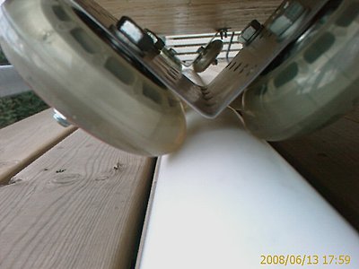 they work smooooth. I guess there are less contact between the pipe and the wheels with rollerbladewheels than with skateboardwheels, and since the diameter is bigger they have a smoother ride. I bent the metal with a hammer and a workbench. (my english sucks) If you measure out where you want to bend the metal, and then thighten it in a bench, you can just use our bodyweight to bend it. to even the edges out to a harder degree angle you just use a hammer and something hard to hold it against while you hit it. |