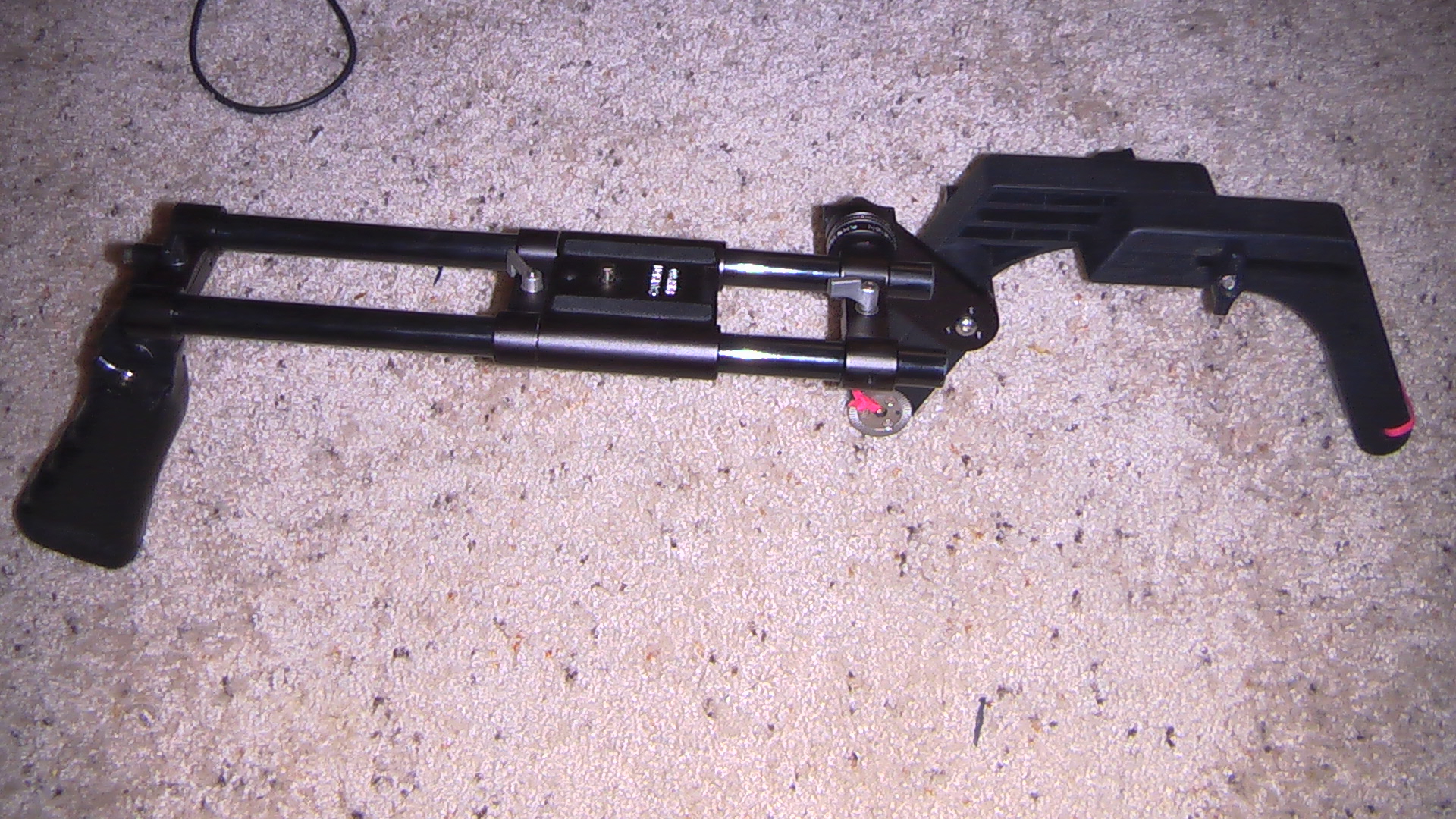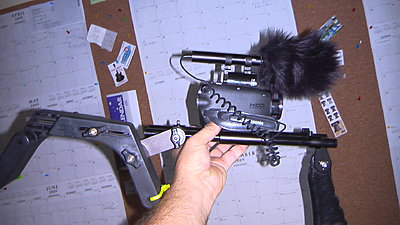 Cavision | RS1580S-SPE Shoulder Pad with Rod System Here is a series of pictures from having alot of attachments to just the bare camera and rig. I have used the cheap light attachment as a lav mount as well. You can also notice my system of camera identification by high end Z.I.P. TIES... Just to stay on topic, I had a scene that involved 5 cars in the middle of my street (SPOILER...was trying to look criminal). Mind you I am the only house on the street. Police just happened to drive by and notice all the cars. Apperently I made it look authentic. As the police pulled up, I started to walk up to them with one of my camera rigs. In the dark they didnt know what it was and drew their guns at me! Lets just say it was an eventful night. |