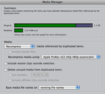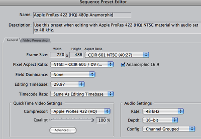 First create a new sequence preset by duplicating the Apple ProRes (HQ) NTSC 48Khz setting and then modify the field dominance to "none" (which is the same as progressive) and checkmark "Anamorphic 16x9." Change the name to something like "Apple ProRes (HQ) 480p Anamorphic." Click OK. Now select all the 1080p30 clips you have ingested and open Media Manager. Select "recompress" and choose your new Apple ProRes (HQ) 480p Anamorphic setting. That's it. When you are ready to edit create a new sequence and use your new sequence preset.