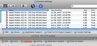 Macintosh HD>Applications>Final Cut Pro Additional Easy Setups>English to Macintosh HD>Library>Application Support>Final Cut Pro System Support>Custom Settings |