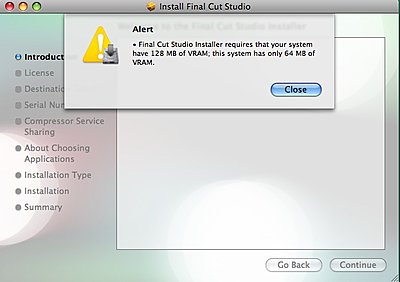 "Final Cut Studio Installer requires that your system have 128 MB of VRAM; this system has only 64 MB of VRAM." Any workarounds to get around this? Thanks, Heath