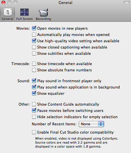 In QT 7 there was (and still is for Leopard users who opted for reinstalling that as an option) to have compatibility with FCS (see screen-grab). If your output is primarily for DVD or broadcast (SD or HD) then having this checked will show you a very close approximation of what the end-users will see. However if your output is primarily web or mobile content then you need to un-check this option as web players even on the windows-side will have a brighter gamma response. Quicktime "X" which is the default player for Snow Leopard does not have *any* controllable options for color-matching, in fact it has NO user-selectable options at all. Quicktime 7 should continue to be the de-facto standard player for any professional video playback. Also, only FCP/FCS suffers from this gamma mismatch between canvas/viewer and external players. Premiere Pro, Avid and Media 100 all have this properly figured out; why Apple's own software hasn't had this bug addressed (going on more than 3 years now) is yet another head-scratcher from the wonderful world of "iPhone-land". |