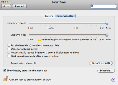 I'd say this is not the same kit since the pricing is drastically different; the kit you purchased is only $60 while the MCE kit is $99. There are also a host of complaints posted right on the Powerbookmedic.com site about poor installation and the drive spinning-down when not being used; I suspect that's whats happening with your drive - if it's not being read from or written to it will spin down in "idle" mode. Make sure in System Preferences/Energy Saver that you un-check "..put drives to sleep...", (see screenshot) this should prevent them from spinning down. A quick call with MCE verifies that there's nothing in their kit that would override this setting in Preferences; if your disk is still spinning down/disconnecting after setting up that preference then I'd say there's something goofy with the controller supplied by Powerbookmedic.com. I've not seen this kit before and I'm glad you brought it up; so far it doesn't look to be quite the same-quality product that MCE produces. |