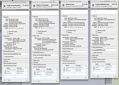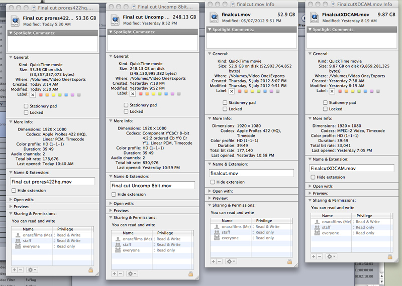My biggest priority is to not lose any quality going from the xdcam in the final cut timeline to whatever format the grade is in and then back to a format for burning to bluray and dvd. It's going through these stages that worries me about losing quality. I think prores 422 is supposedly lossless but it’s an encode and then if you grade the prores and then render back to prores doesn’t that count for one more drop in quality? I rendered out a prores, an uncompressed file and then the xdcam which theoretically should have been raw output as the timeline is xdcam. The prores is a much bigger file. XDCAM EX is around 35mbits and the resulting encode is 33,041 which sounds right. The prores is 178,676 bitrate so much higher. I did an uncompressed too and it was 830,976 which is huge. See attached screengrab with file details. Last edited by Damian Heffernan; July 7th, 2012 at 06:20 PM. Reason: image fixed |