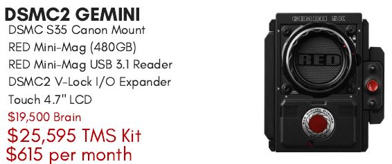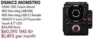 Lease Payments: $615 48m, $800 36m, $1165 24m Helium Essentials Kit $30,595 Lease Payments: $740 48m, $955 36m, $1275 24m at 0% Monstro Essentials Kit $60,595 Lease Payments: $1492 48m, $1935 36m, $2580 24m 0% Each Kit Includes the DSMC2 Brain with the following accessories: DSMC S35 Canon EF Mount RED Mini-Mag 480GB RED Mini-Mag USB 3.1 Reader DSMC2 V-Lock I/O Expander RED Touch 4.7" LCD 0% 24 Month Lease Financing Available for Helium & Monstro Cameras Apply Online: https://texasmediasystems.com/leasing |