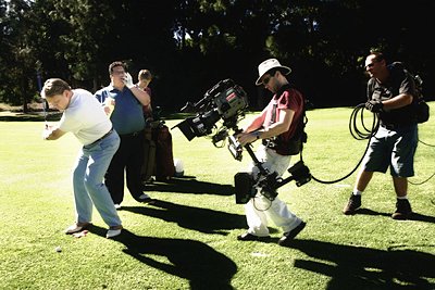 Below is a still from an old Genesis job with the camera in two-piece mode, and grip carrying the backpack and cable wrangling. Old school style, indeed. Having shot plenty of two-piece 3/4" back in the day, it's certainly reminiscent of that (although the backpack weighs a lot more than the old--what was it? BVU-110?)