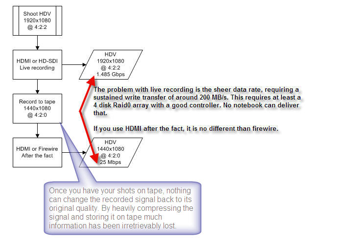 Interesting chart. It appears that the lower part of the chart assumes one would import via HDMI back into HDV. This is not the concept we are discussing and would certainly show no benefit. The idea is to take the HDV footage and get it out of HDV into a more usable codec for post work. The HDMI interface facilitates this objective rather easily. Of course, it does not change the quality of the original footage rather it prevents any more damage being done to it. That is the advantage of using the HDMI interface provided by BMD. Otherwise, you could do a separate transcode after you captured via HDV, which some still do with Cineform. That adds an extra step that I prefer to avoid. -gl