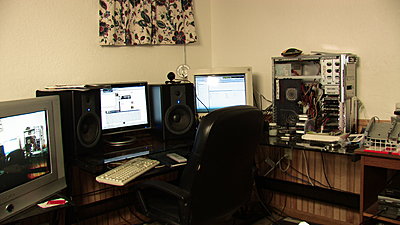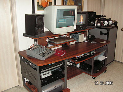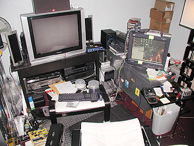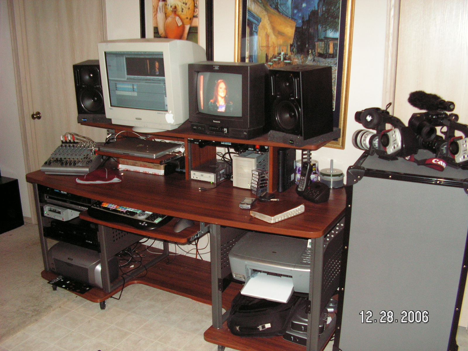 Dell Dimension 5100 Pentium 4 3ghz 2Gigs Ram 400 gigs internal drives 2 Rocstor External Drives 1 Seagate External Drive JVC MiniDV Deck Vegas 6 Ikea Poang Chair Sofa for the occasional siesta. Big mess for the occasional cleaning. |