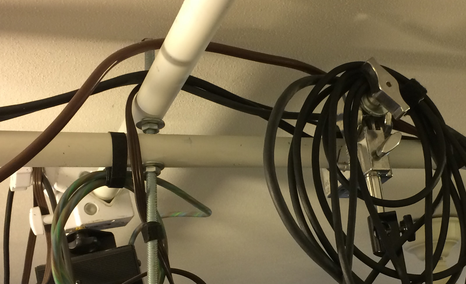 Each pipe extends past the rods at the corner to within 6" from the wall. I found this very flexible and have a gaggle of fixtures hanging all over for different scenes. Velcro straps make cord management easy yet flexible. I also rigged edison sockets in each corner to provide light in the studio without burning my good lights. One switch toggles between room lighting and video lighting. |