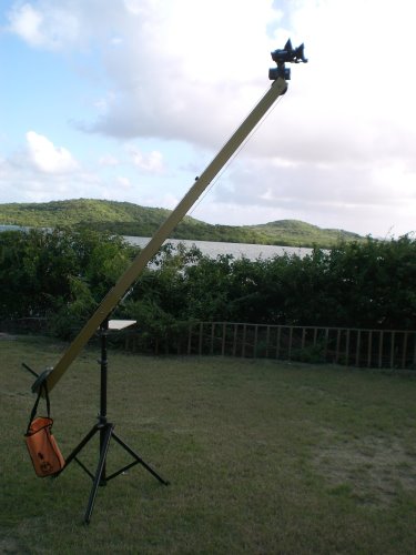 I have been building a crane for a while, and what started out as a pretty quick way of getting my camera high up has turned into a pretty major project. The crane now has a full pan tilt head with a programable computer controlled fan cooled progressive joystick controlled controller. I also have a fairly unique cable and bungee cantilever system to keep the head level, which replaces the solid bar often seen on home made cranes.