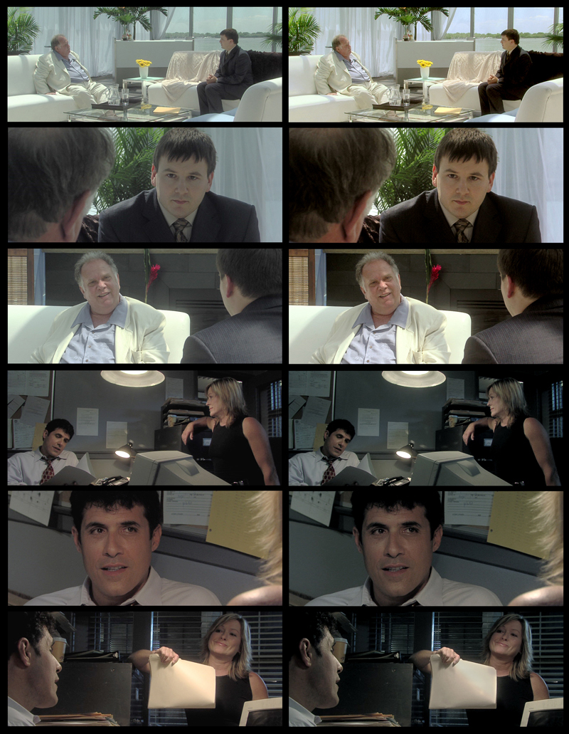 I concur with Liam. You could also shoot a few seconds of a 18% gray card (very inexpensive) for each camera setup and easily correct the white point with the eye dropper color-match tool in the 3-way Color Corrector. There are similar tools found in Apple's Color and Avid Symphony. Keep in mind that my DSC CDM28 setting is just a starting point to get you in the zone and if you want precisely accurate reproduction in-camera you really need a scope on-set. I cannot guarantee that each camera will react precisely the same way to that setting because of other minute analog calibrations made by JVC engineers during QC. No two cameras are going to give you the EXACT same response, but that's what color correction is for, right? The DSC CDM28 setting was created using a ChromaDuMonde 28R, a HD250 and my Magni NTSC scopes connected to a downconverted live output as well as the HDV signal connected to DV Rack. The 709 and 601 responses differed slightly (as expected) so I favoured NTSC (the lowest common denominator) since almost everything most of us shoot eventually finds its way to standard def DVD or broadcast. Hopefully this means you won't have the NTSC-illegal reds you may find if you only use DV Rack and HDV/1394 to calibrate to a DSC chart. It was actually pretty difficult to fine tune the matrix to get as close as possible to the theoretically "perfect" response as shown on DSC's website. The 28 colours are very helpful and I would recommend that anyone in the market for a DSC chart try to buy the most colours you can afford. A 6 or 12 colour chart is not going to help you zone in on the some of the problem colours in the blue/magenta zone as well as 24 colours will. The vectorscope may look correct with less colours, but in reality certain shades may be way off. Michael Kent at DSC wrote a great article about this recently. I'll post a link if I can find it. I also want to stress that calibrating to a DSC chart (even a Toni with cavity black) does not necessarily mean you will be capturing the 'maximum' dynamic range possible on the camera. It might be close, but any front lit chart has its own maximum dynamic range and many cameras can exceed it. The goal of the Superwide setting is very different and really boils down to utilizing manual knee, a lowered cine gamma and black stretch to produce a low contrast image that can offer maximum manipulation in colour correction. Please consider it a proof-of-concept or a learning tool and experiment with knee, gamma and black stretch for your scenes and then fine-tune your colour with the matrix. I've attached some before/after samples of the low-contrast in-camera capture (left side) and final color correct (right) using the "Ciné Wide" setting on an HD100. These are from a film I shot called Bull. You can see how the low-contrast image is not very pleasing to the eye, but gives us lots of room to play in post, even with white furniture, white wardrobe and windows.