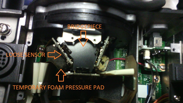 After messing around with a small plate dummied up out of thin cardboard mastered to a good but electronically faulty sensor block and manually adjusting the opposite end of the blue sensor PCB which remained floating, it seems that it may be possible to remount the blue sensor mechanically without adhesive although with adhesive would be a better fix.