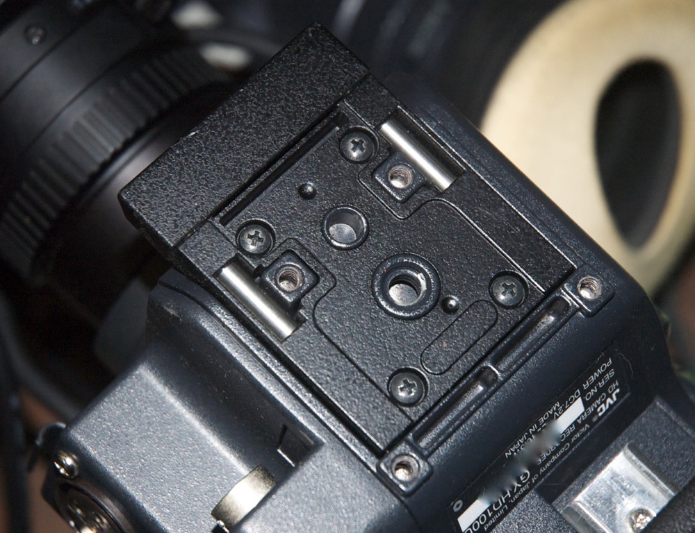 Like the HD200 series, the HM700 ships with a "V-mount" for quick-release plates already attached. JVC have designed the new "V-Mount" as a two-piece unit with a total of 7 screws (instead of 4.) Four screws hold the square black alignment rails piece and the other three screws attach the steel "V" piece to molded "posts." The screws aren't even the same size or pitch. My Cavision mount has loads of other holes for mounting on different cameras but those three molded posts mean that I can't even get it flush to the camera. So I guess anyone upgrading with the intent to use their old rails is SOOL. Now I guess its a waiting game for third-party companies to design new systems that are compatible with the new mold.
