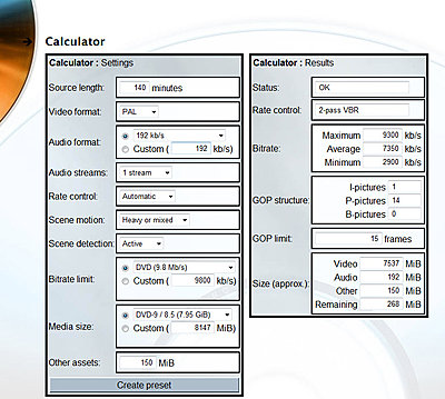 I know that post # 1 is often overlooked. You mentioned a duration of 2:20 hours. Here are the results you could have found had you used the calculator I linked to, so there is no need to experiment with other, lesser settings. These are the best settings to fit it all on a single DL DVD: |