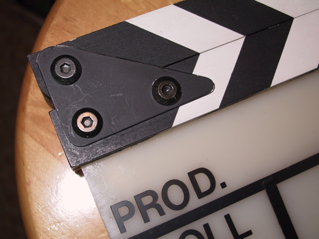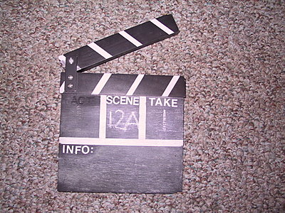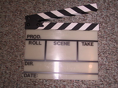 I actually made mine out of a flat piece of PVC and some wood. I got the PVC at a junkyard, but you might be able to find something at a hardware store. I got some black tape and lettering for the words scene and take. I also took a piece of wood, fabricated a hinge, sprayed it black and white, and attached it to the top. I'll try to get some pictures up later.