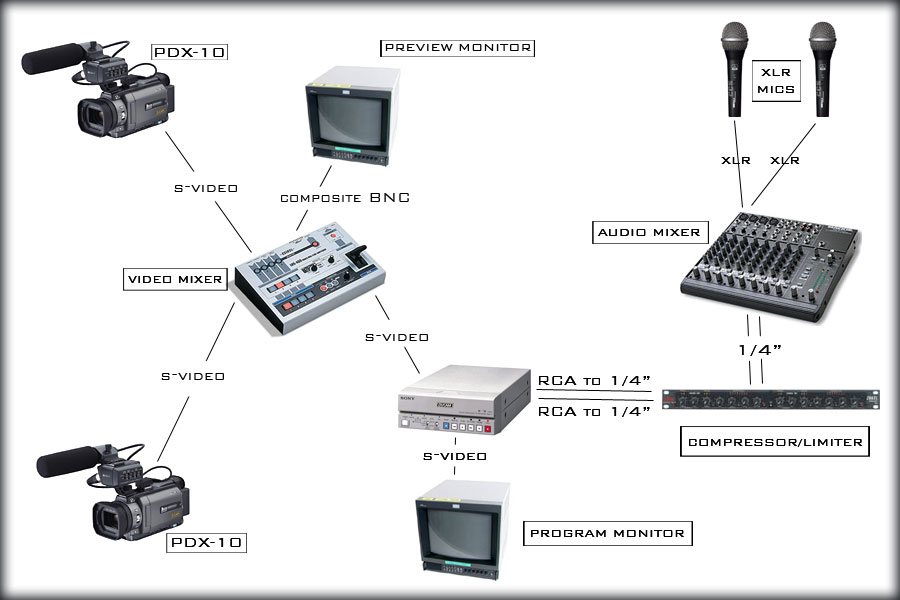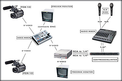 The Edirol LVS400 is a good mixer, and much easier to use than the V-4 (the one made for clubs). I've never used the Panasonic mentioned, but I've had much better experiences with the Edirol over the Videonics. I've used and sold both in the company I work for. I'd set up a system like this....diagram attached. The DSR-11 isn't the greatest choice for this because it only offers an unbalanced audio connection, and has no audio meters to monitor the incoming audio levels. Just keep your levels right at the mixer and the compressor, and you should be ok. If you more money to spend, you could buy a rackmount of three monitors...use two of them for preview monitors and the third one for a program monitor. It may be cheaper to do that anyway. Good luck! |
