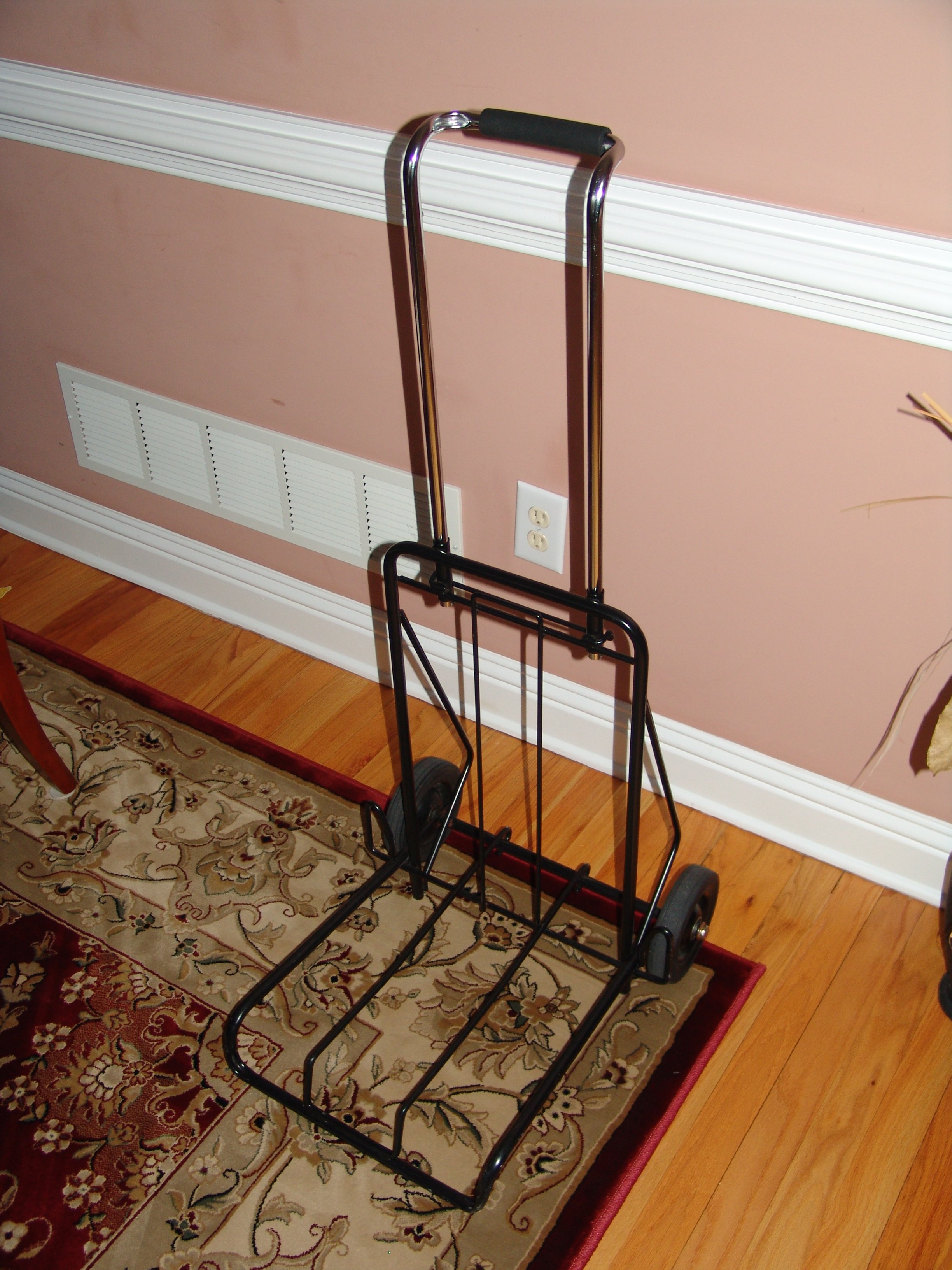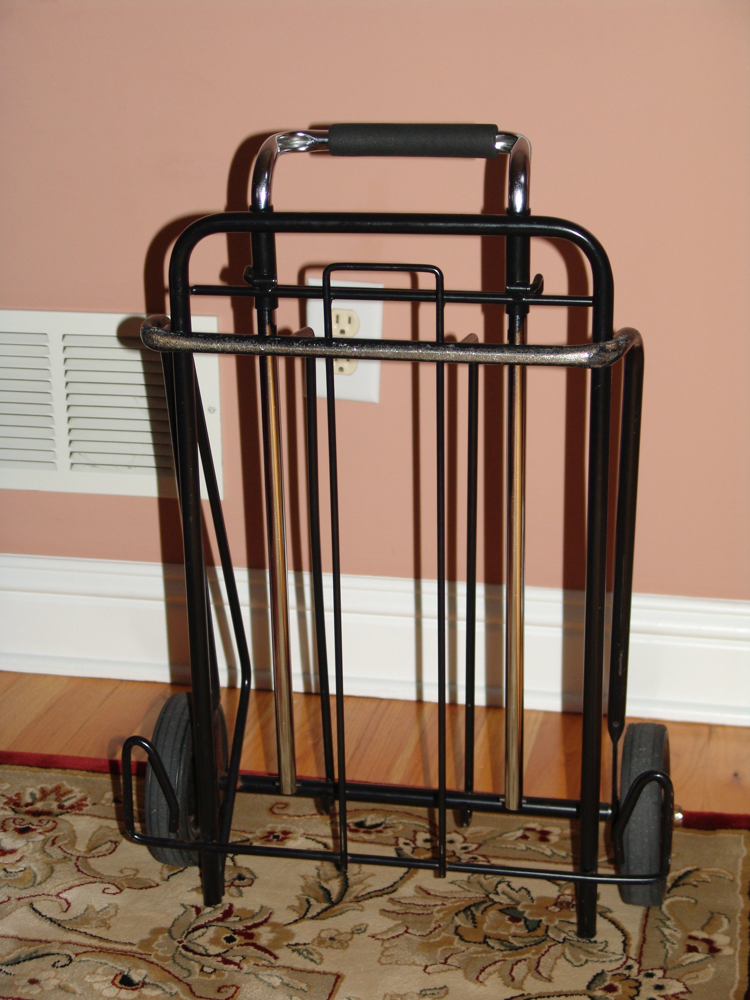 I don't recall where I bought it, (I want to say Staples, about 7 yrs ago), but I do recall It was classified as a luggage cart and, I think, capable of loads up to about 85 lbs. but not sure of that. I use it when I need only a minimum of equipment, but even then, the most difficult task I've found is securing a tripod to it. I've used multiple bungees, but no matter what I've done, so far I haven't been satisfied with attaching a tripod & bag to it. One thing about it that bothers me is having to go up/down curbs or stairs. If you look low at the rear, i.e. the side from where you'd be walking & pulling it from, there are angled braces near the wheels that jut out in the opposite direction from the "platform" or foot. Over time, I've found that those braces have begun to wear from scraping as the cart is dragged up or lowered on stairs or curbs. Being soft aluminum, they can wear pretty fast. On stairs, I must be particularly careful if they are wood, as those angled braces could mar both the treads and the risers. In those instances, I'll simply lift the entire cart rather than let it damage the stairs. Working primarily as an OMB, a frequent problem for me when lugging extra equipment is getting a tripod & bag through a revolving door. I'd like to find a cart that is essentially a lightweight, collapsible cage with 4 wheels, (kind of like a typical shopping cart but stood on end), that is slightly less wide than the width of a typical door, i.e. one in which I could have a tripod/bag stand upright and still fit 1 or 2 cases. Haven't found one yet. (With the right wheels and handle, in a pinch it might also serve as a camera dolly).