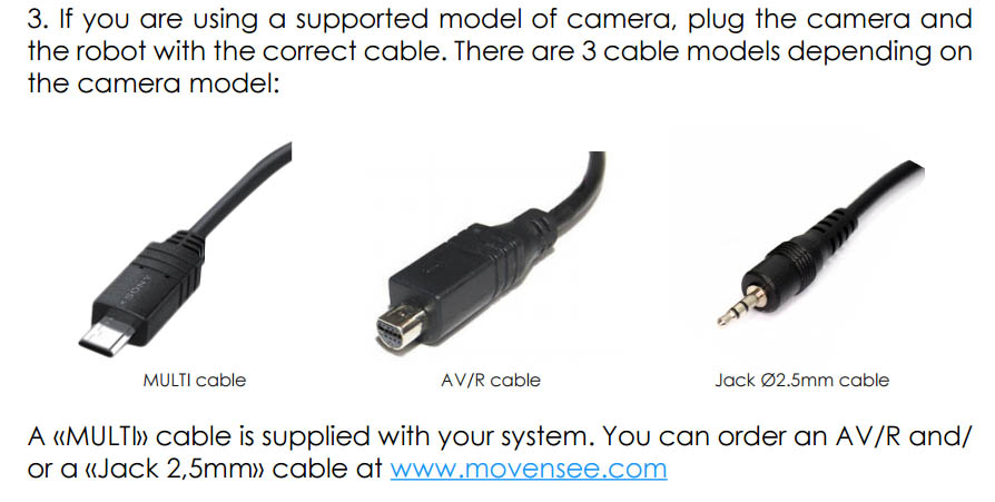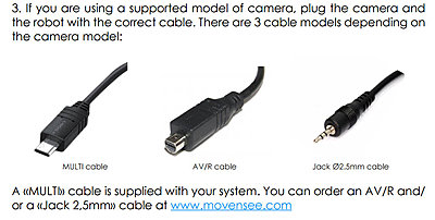 I did some research and the robotic unit is using the LANC remote protocol, which is why it only works with Sony and Canon cameras - Panasonic has their own control protocol. Here is a link to Sony and Canon models recommended by Move n See - PIXIO Customer Care Center - Move 'N See Most of the new Sony cameras use a proprietary multi-plug, and that is included with the Move N See. LANC originally used the 2.5mm jack, and later Sony used the AV/R plug, but newest models typically have the Multi connector. According to Movensee.com, all Canon cameras use the 2.5mm jack. Whichever camera you decide on, find out what connector it has in case you need to order an adapter, so it doesn't delay using the new device.