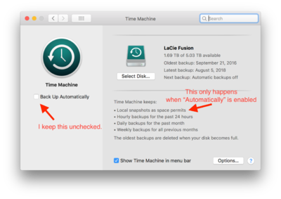 The time machine snapshot issue is not new, it has been discussed for years. But MacOS has been pretty good at freeing up that space when it was actually needed for something. I've been using Time Machine on my laptop for the past 7 years or so and haven't had any problems. I have an Apple Time Capsule and it constantly backs up over wifi. Has come in handy a few times when I accidentally deleted something. But I have a separate Mac just for video editing and have time machine disabled on it. I use Carbon Copy to make bootable clones of all my Macs as well. I would never actually restore a full computer from a Time Machine backup unless all my other options failed, it's just too slow for that kind of thing. Since I was finally able to get a fast FIOS internet connection last year, I now have 4 different computers with a total of about 8TB of data that are continuously backed up to the Cloud with BackBlaze as well. |